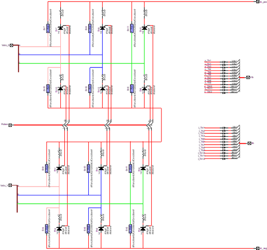 EMTP® model of 12-pulse LCC converter. Each thyristor switch is paired with an RLC snubber.