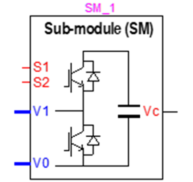 Each phase arm of the MMC model is an assembly of several Sub-Modules (SMs) in series. SMs are half-bridge converters, containing a capacitor and two IGBTs with