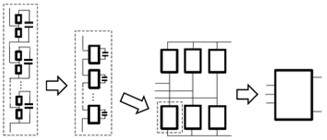 Switching function of arm model further simplifies the model by replacing the entire MMC arm with a switching function that calculates the total arm voltage and current based upon the number of switches in the ON state. It also assumes a uniform voltage distribution among the arm capacitors to replace them by a single equivalent arm capacitor Carm=C/N, where N is the total number of SMs in the arm. Switching function of arm model doesn’t represent the individual SMs, so the balancing control of capacitor voltages cannot be studies with this model, however, higher level phenomena such as the circulating currents and conduction losses are still considered.