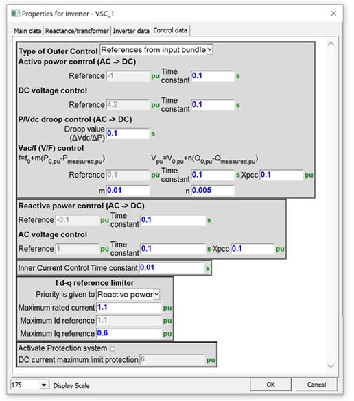 There are four different outer loop control methods built in the EMTP® Inverter model: Active power control, VDC control, P/ VDC Droop Control and VAC/f control.
