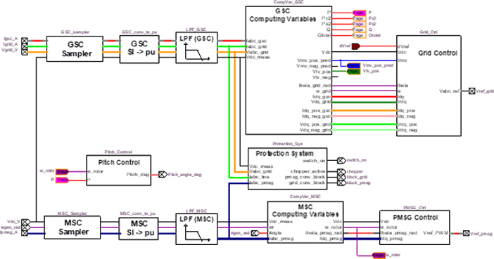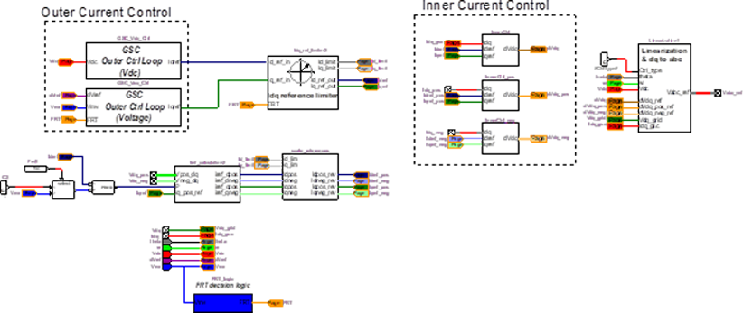 The converter control is modeled in detail with the measurement sampling and filtering, the Phase-Locked Loop (PLL), the regulation loops and the protection system.